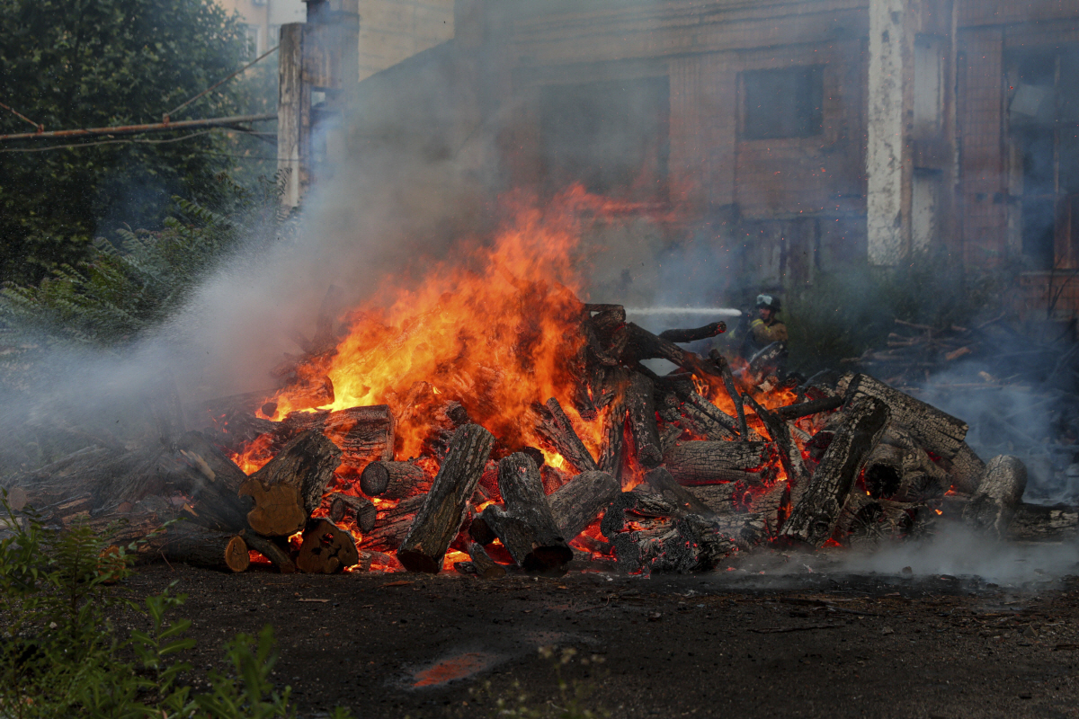 우크라이나 자포리자에서 14일(현지시간) 소방대원이 러시아 드론 공격 현장에서 불을 끄고 있다. 자포리자/AP연합뉴스 |