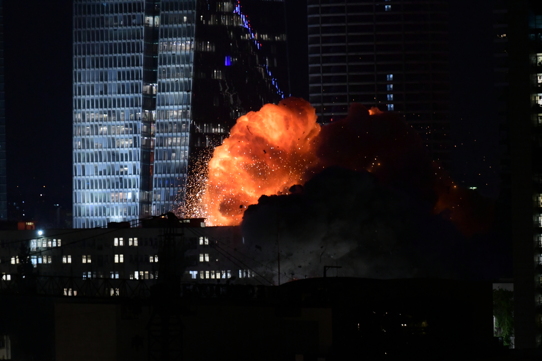 지난 13일(현지시간) 이스라엘 텔아비브의 한 빌딩이 미사일 공격을 받고 있다. MDA=연합뉴스 |