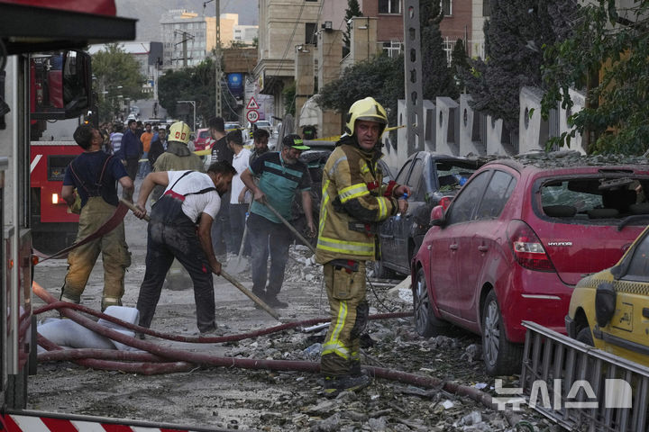 [테헤란=AP/뉴시스] 6월13일 이란 테헤란 북부의 한 주거 단지에서 이스라엘의 공습으로 폭발이 발생한 후 소방관들과 주민들이 잔해를 치우고 있다. 이스라엘방위군(IDF)은 이날 새벽 이스라엘이 이란의 핵·군 시설에 대한 선제타격을 개시했다고 성명을 통해 밝혔다. 2025.06.16. |