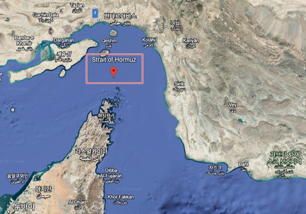 호르무즈 해협의 모습. 전 세계 원유 수송량의 20%가 호르무지 해협을 통과한다. /구글어스 캡처 |