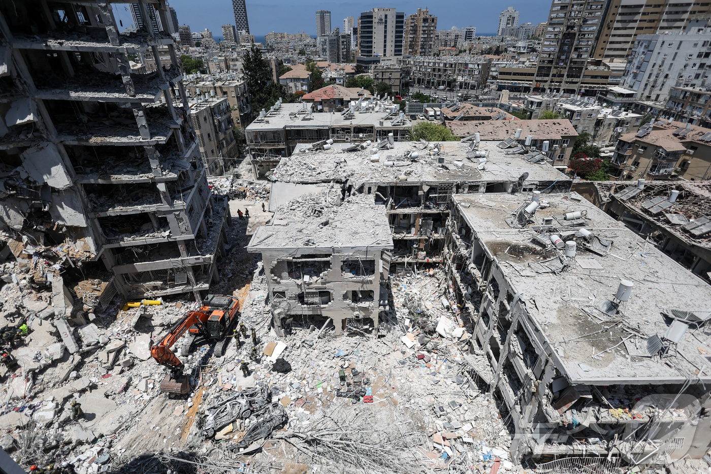 (로이터=뉴스1) 박세연 기자 = 15일(현지시간) 이스라엘 수도 인근도시 바트얌이 이란의 미사일 공격을 받아 폐허가 되있다. ⓒ 로이터=뉴스1