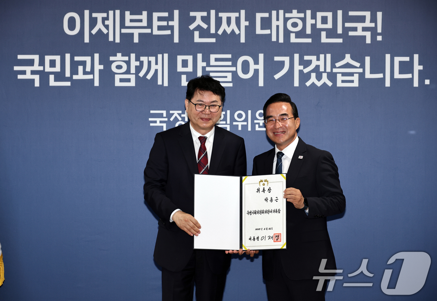 (서울=뉴스1) 신웅수 기자 = 이한주 국정기획위원회 위원장(왼쪽)이 16일 서울 종로구 정부서울청사 창성동 별관에서 열린 출범식에서 기획분과장을 맡은 박홍근 더불어민주당 의원에게 위촉장을 수여한 뒤 기념촬영을 하고 있다. (공동취재) 2025.6.16/뉴스1