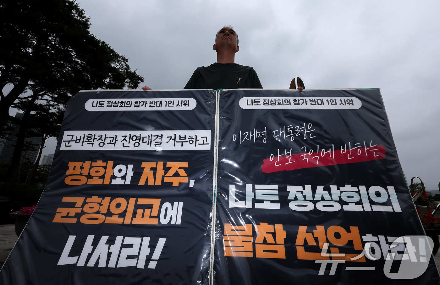 (서울=뉴스1) 김성진 기자 = 평화와통일을여는사람들 관계자가 16일 서울 용산구 대통령실 앞에서 이재명 대통령 나토 정상회의 참가 반대 1인 시위를 하고 있다. 2025.6.16/뉴스1