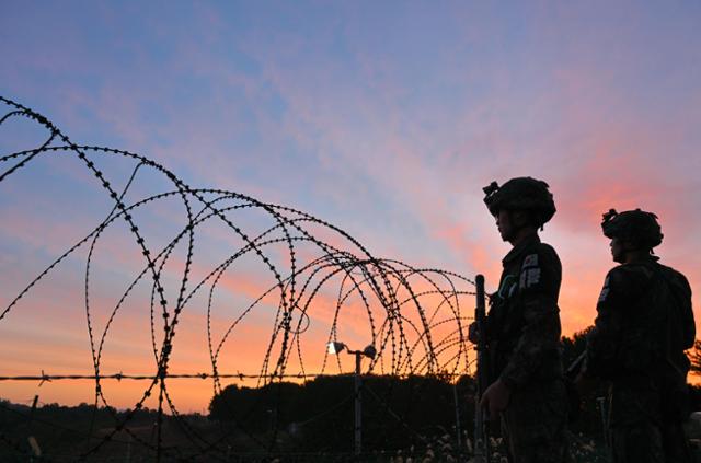 경기 연천군 육군 제5보병사단 GOP 부대에서 장병들이 동트는 새벽 시간, 북쪽을 응시하면서 경계를 늦추지 않고 있다. 한국일보 자료사진 |