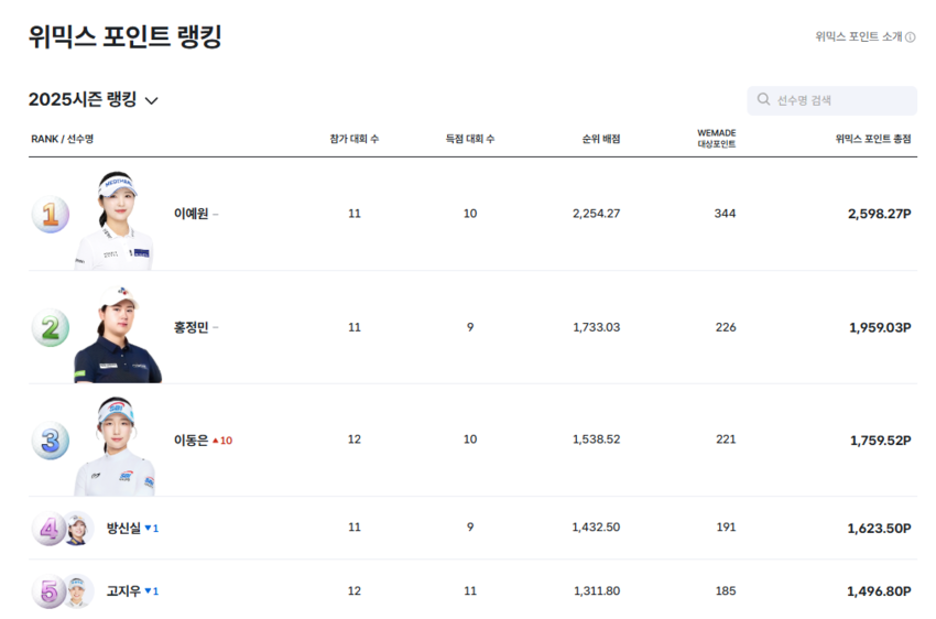 금주 위믹스 포인트 TOP5 랭킹은 1위 이예원(2,598P), 2위 홍정민(1,959P), 3위 이동은(1,759P), 4위 방신실(1,623P), 5위 고지우(1,496P)이다. 선수별 보다 자세한 순위는 위믹스 포인트 랭킹 홈페이지(https://wemix.golf.sbs.co.kr/point)를 통해 확인할 수 있다.
