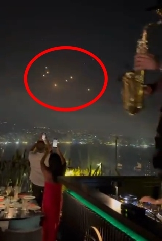 엑스에 공개된 영상을 보면 높은 건물의 옥상층으로 추정되는 공간에 많은 사람이 모여 술을 마시거나 음악을 즐기고 있다. 이들 뒤로 컴컴한 밤하늘을 가로질러 날아가는 미사일이 선명하게 보인다.