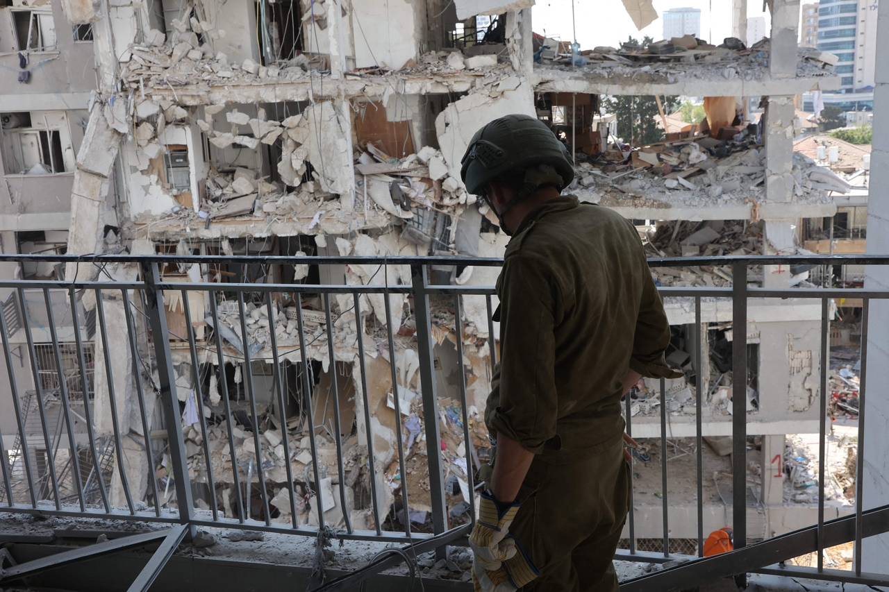 지난 15일(현지시간) 이란의 미사일 공격 현장에서 이스라엘 군인이 잔해를 둘러보고 있다. [AFP] |