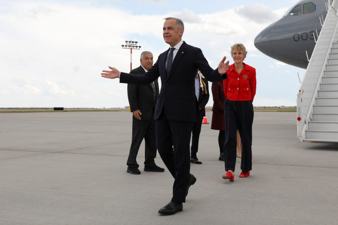 15일(현지시간) 캐나다에서 G7 정상회의가 열리는 가운데 캐나다 앨버타주 캘거리 국제공항에서 마크 카니 캐나다 총리가 환영의 제스쳐를 취하고 있다.(사진=로이터) |