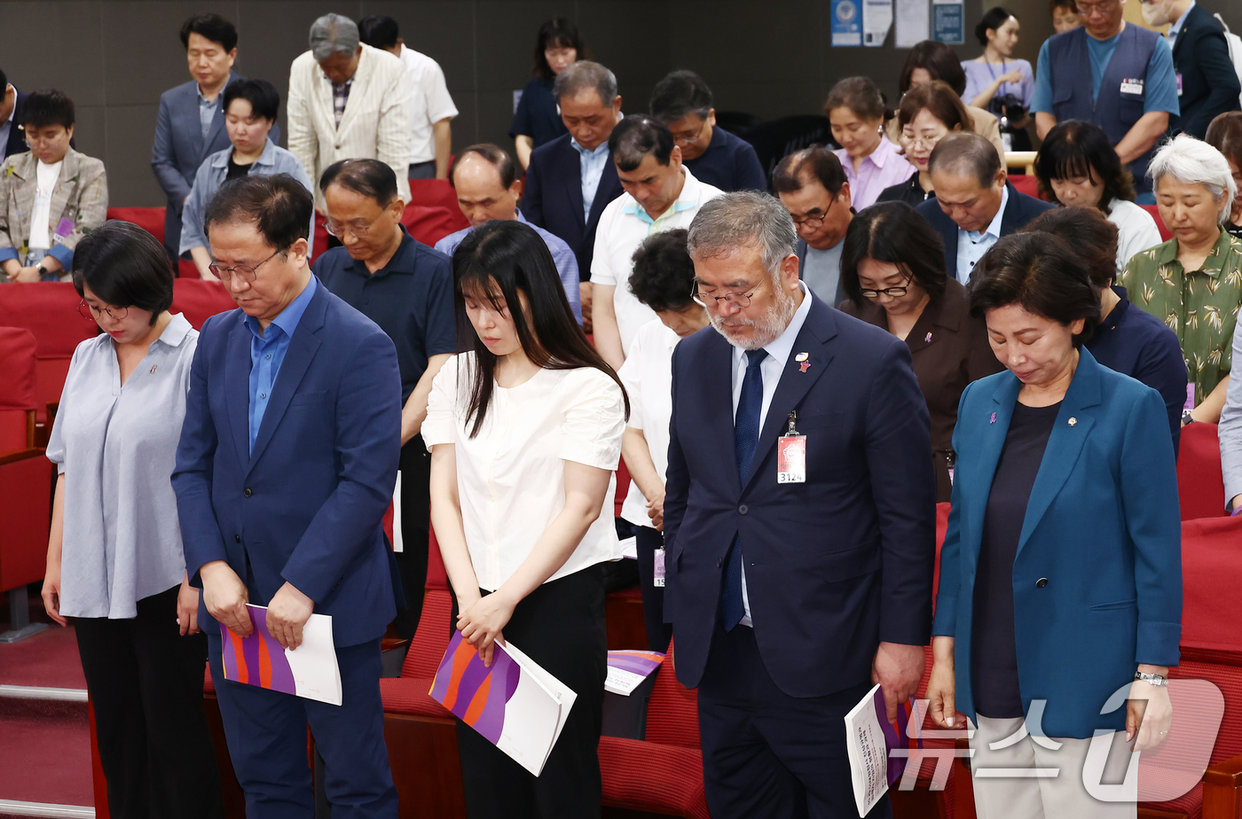(서울=뉴스1) 김민지 기자 = 남인순 더불어민주당 이태원참사특별위원장을 비롯한 이태원참사 유가족협의회 관계자 등이 16일 서울 여의도 국회 의원회관에서 열린 '10.29 이태원참사 피해자권리보장과 진상규명 및 재발방지를 위한 특별법 시행 1년 토론회'에서 희생자들을 위해 묵념하고 있다. 2025.6.16/뉴스1
