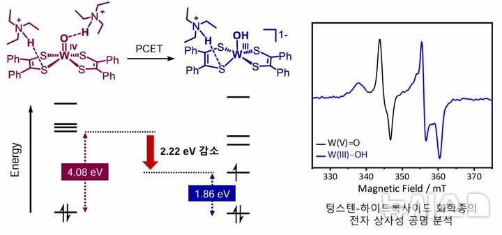[광주=뉴시스]수소결합에 의한 분자 궤도 에너지 준위 감소 현상(왼쪽)과 전자상자성공명(EPR) 분석에 의해 생성이 최초로 관찰된 텅스텐-하이드록사이드 화학종(오른쪽). |