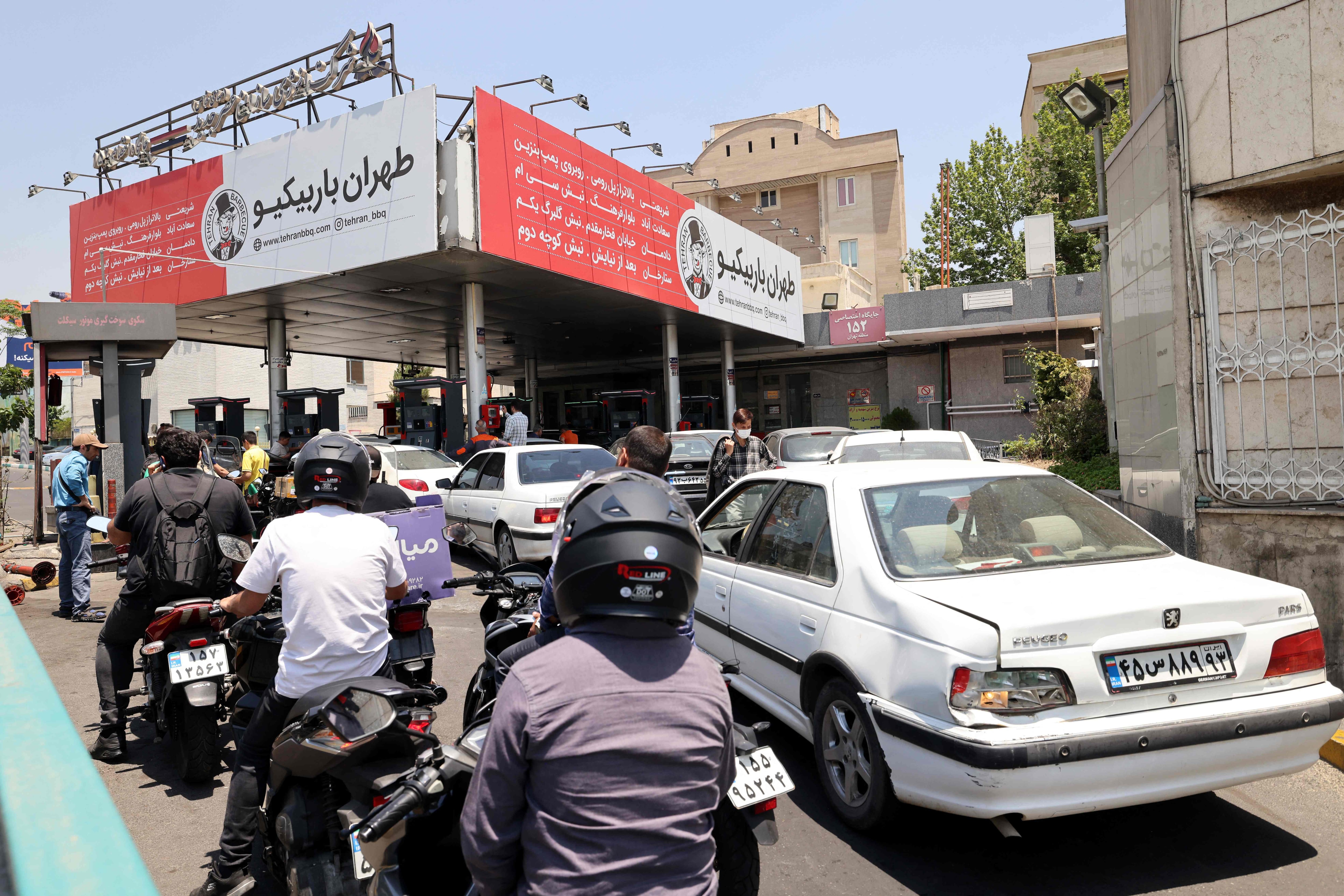 15일 이란 테헤란의 주유소에서 대기하고 있는 차량 행렬./ AFP연합뉴스 |