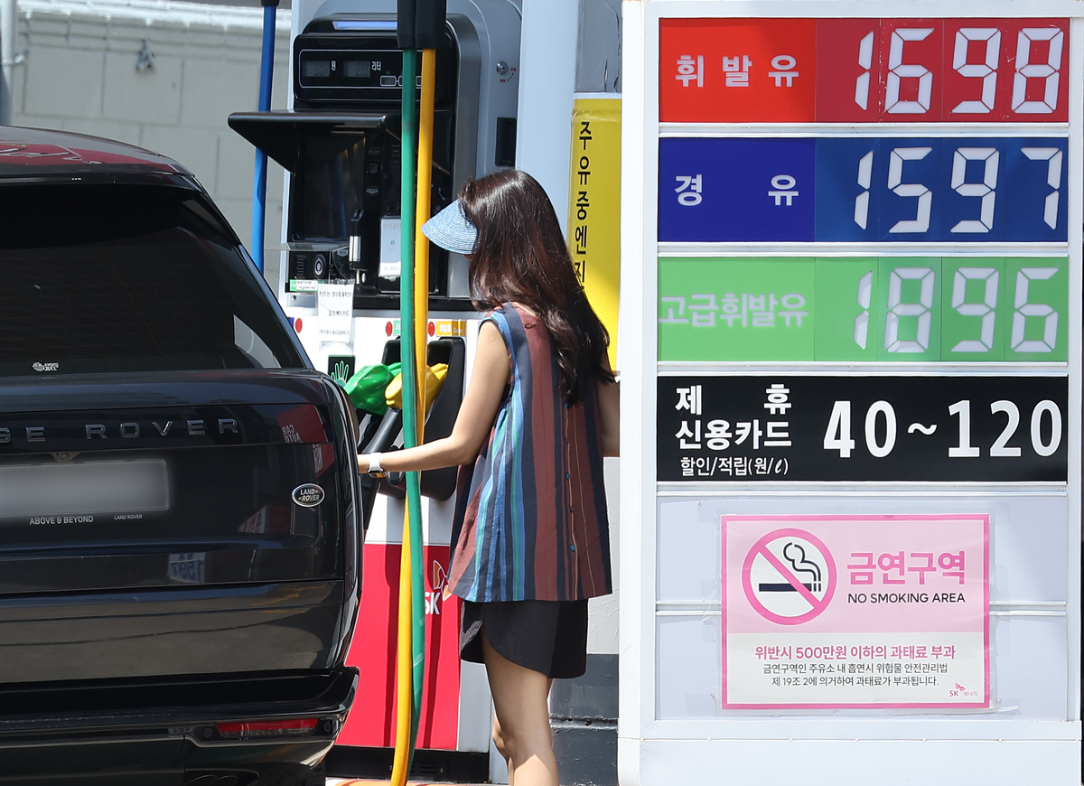 한 시민이 15일 서울의 한 주유소에서 차에 기름을 넣고 있다. 정부는 16일 유류세 인하 조치를 2개월 더 연장하기로 했다. 연합뉴스 |