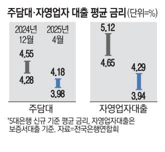 16일 전국은행연합회 통계 자료에 따르면 올해 5월 말 발표한 5대 시중은행(KB국민·신한·하나·우리·NH농협은행)의 4월 평균 주담대 금리는 3.98~4.18%였다. 이는 직전 월 대비 최소 0.2%포인트, 최대 0.34%포인트 낮아진 것이다. 자영업자 보증서대출은 금리가 3.94~4.29%였다.