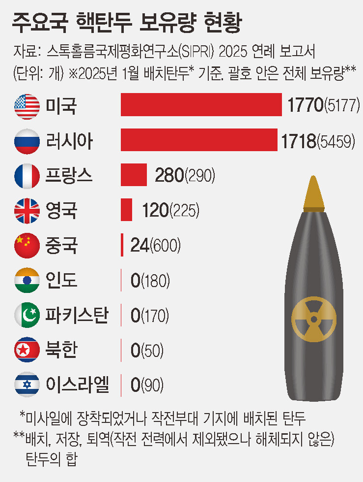 스톡홀름 국제평화연구소(SIPRI·이하 연구소)는 15일 공개한 ‘2025 연례 보고서’에서 세계 핵탄두의 대부분을 보유한 미국과 러시아가 미래에 핵전력을 다양화하고 규모를 늘릴 수 있도록 “자국의 핵탄두를 현대화하고 교체하기 위한 광범위한 프로그램”을 가동하고 있다고 밝혔다. 미·러를 제외한 핵전력 보유국(프랑스·영국·중국·인도·파키스탄·북한·이스라엘)들도 지난해 핵무기 현대화와 핵무기 운반체 개발 등을 지속한 것으로 알려졌다. 연구소는 이런 추세 속에 핵 군비 통제의 위기와 새로운 군비 경쟁 조짐을 우려했다.