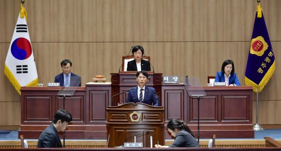 박필순 광주시의회 의원이 16일 제332회 1차 정례회 본회의에서 '긴급현안질문'을 하고 있다. 광주시의회 제공 |