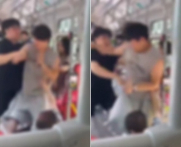 버스 안에서 노인을 폭행한 20대 남성(회색 옷)을 시민(검은색 옷)이 제압하고 있다. 보배드림 영상 캡처 |