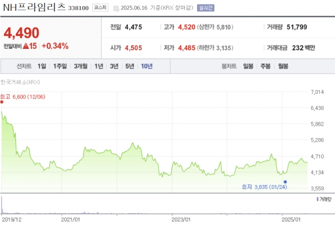 NH프라임리츠는 2019년 12월 5일 상장했다. 주가는 다음날 6600원으로 최고가를 찍었고 이후 내렸다. 올해 1월 24일에는 3835원으로 최저가를 기록했고, 이후 4400원대로 올랐다. 이날은 4490원으로 장 마감했다.