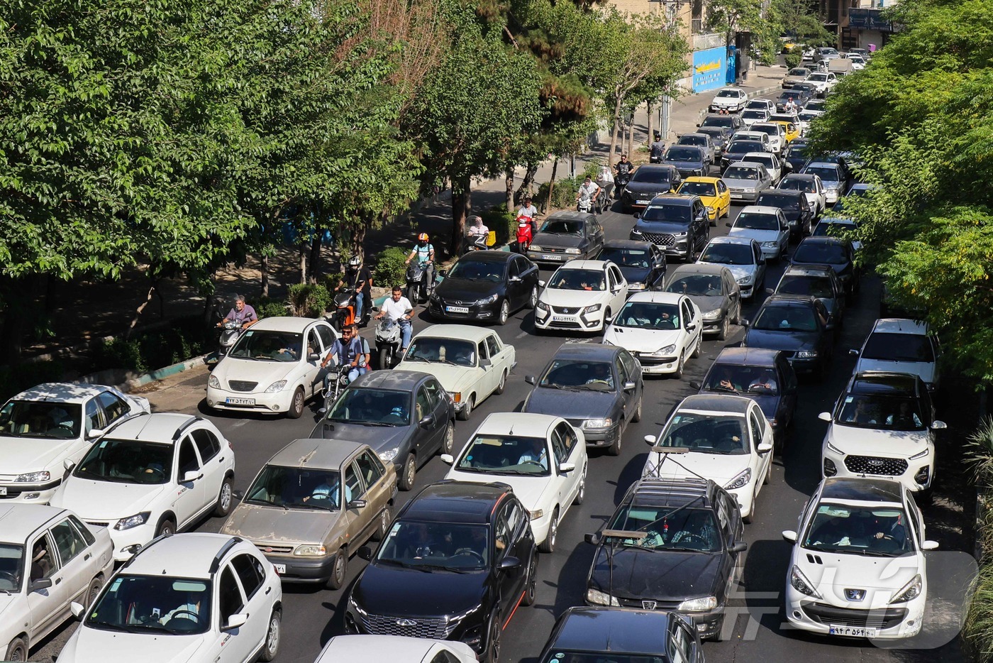 2025년 6월 15일 이란 수도 테헤란 서부의 주요 도로에서 도시를 빠져 나가기 위해 차량들이 줄지어 서있다. 이스라엘과 이란 사이 군사 갈등이 격화하며 대낮에도 미사일 공격을 주고 받았다.ⓒ AFP=뉴스1 |