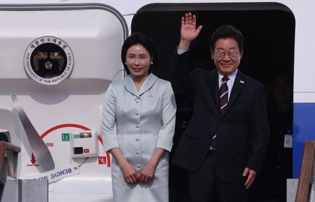 이재명 대통령과 김혜경 여사가 캐나다 앨버타주 캐내내스키스에서 열리는 주요 7개국(G7) 정상회의 참석을 위해 16일 경기 성남 서울공항에서 공군 1호기에 탑승하기 전 인사하고 있다. 왕태석 선임기자 |