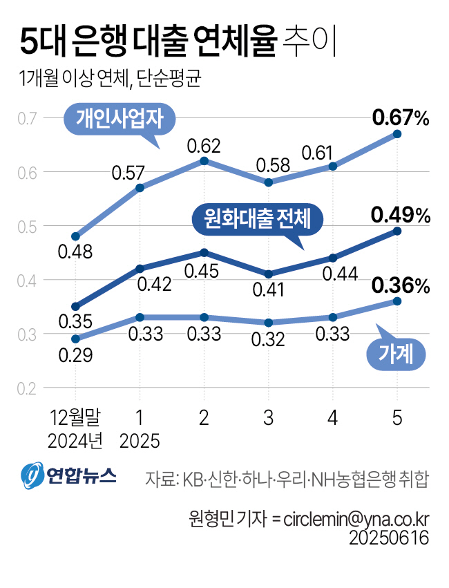 5대 은행(KB국민·신한·하나·우리·NH농협)의 5월 말 기준 전체 원화 대출 연체율(1개월 이상 연체) 평균값(이하 단순평균)은 0.49%로 집계됐다. 4월 말(0.44%)보다 0.05%포인트 올랐다. 지난해 12월 말(0.35%)과 비교하면 다섯 달 사이 0.14%포인트나 높아졌다. 자영업자 대출 연체율만 따로 보면, 5월 말 평균 0.67%로 한 달 만에 0.06%포인트 올랐고 지난해 말(0.48%)보다 0.19%포인트 뛰었다.