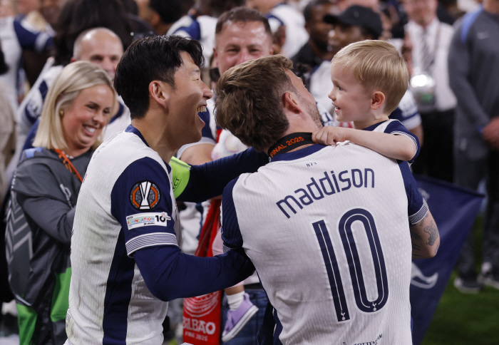 손흥민은 17년 만의 토트넘 우승 가뭄을 털어낸 후 매디슨을 끌어안고 뜨거운 눈물을 쏟아냈다.
