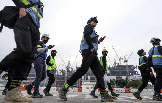 내국인 근로자들이 경기도 한 반도체 공장 건설 현장으로 출근하고 있다. 2023년 6월 모습. 김성룡 기자 |