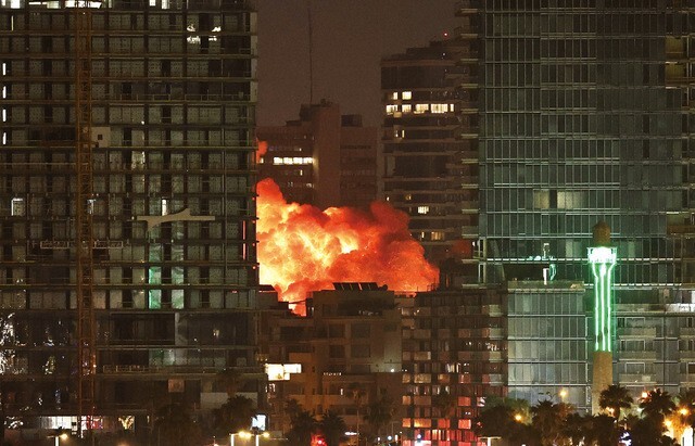 16일 이란이 발사한 미사일이 이스라엘의 수도 텔아비브 도심에 떨어져 거대한 화염이 솟고 있다. 연합뉴스 |