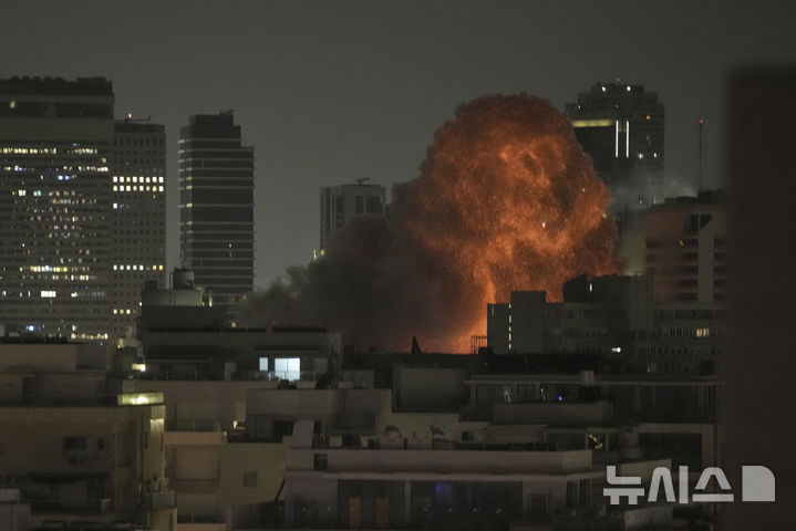 [텔아비브=AP/뉴시스] 15일(현지 시간) 이란의 미사일 공격을 받은 이스라엘 텔아비브에서 폭발이 일어나고 있다. 2025.06.16. |