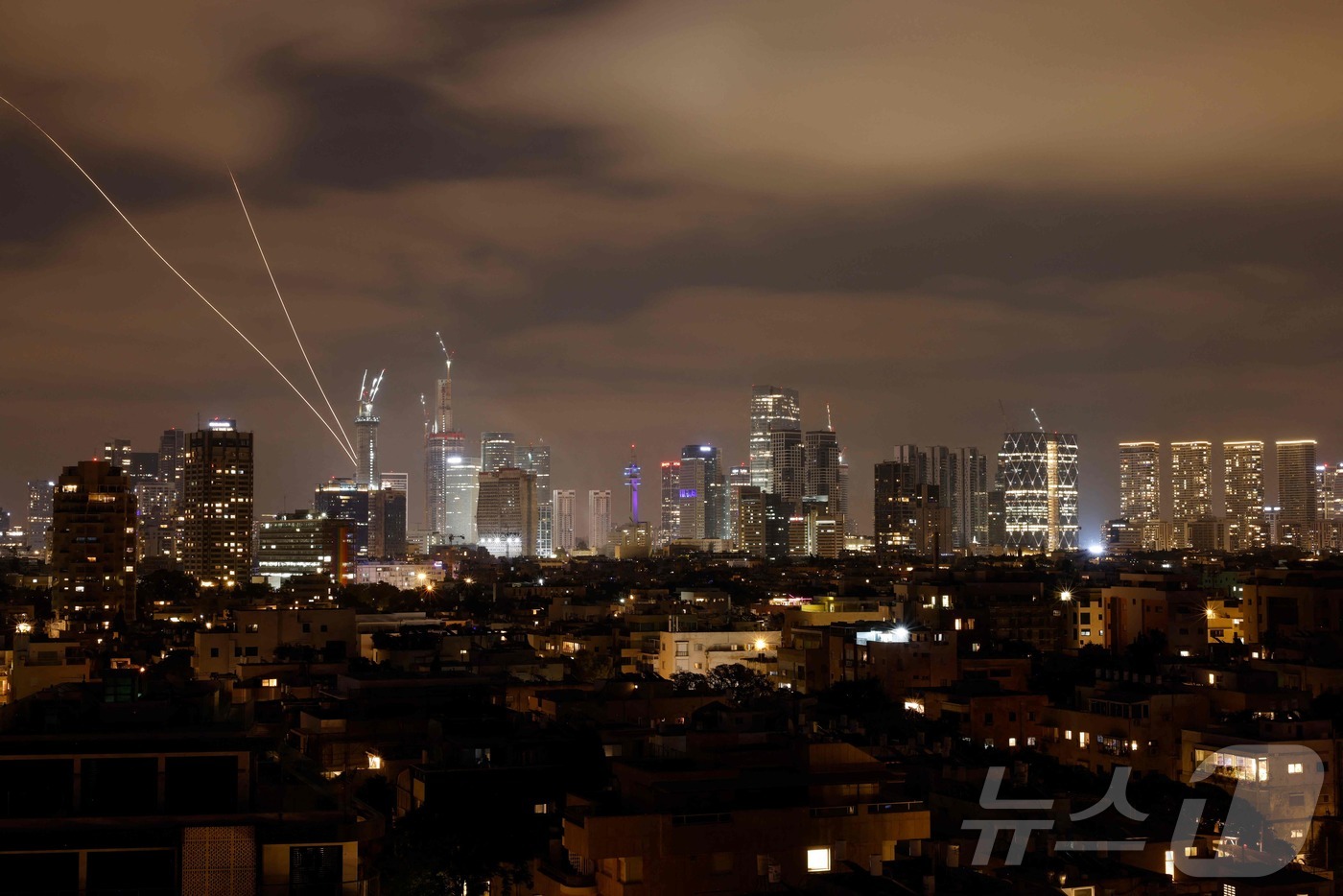 2025년 6월 15일, 이란의 로켓이 이스라엘 텔아비브 상공에서 발사된 가운데 이스라엘 방공 시스템이 가동되어 이란의 미사일을 요격하고 있다.ⓒ AFP=뉴스1 |