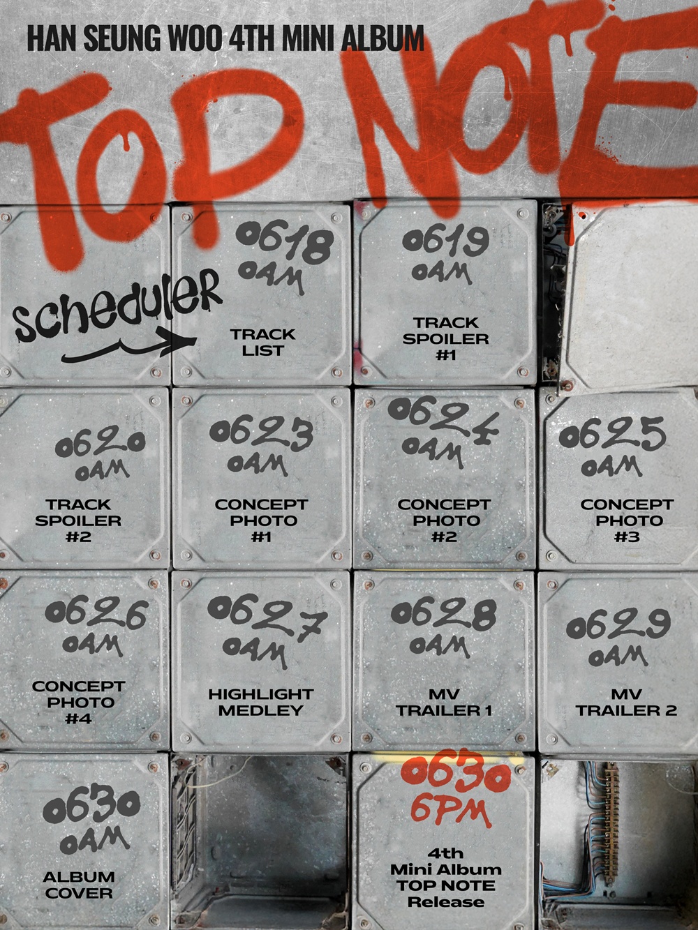 이미지에는 칸칸이 정리된 알루미늄 단자 박스 위에 프로모션 스케줄이 적혀 있고, 거친 질감의 스프레이 글씨로 새겨진 앨범명 'TOP NOTE'가 시선을 끌며 인상적인 분위기를 자아냈다.