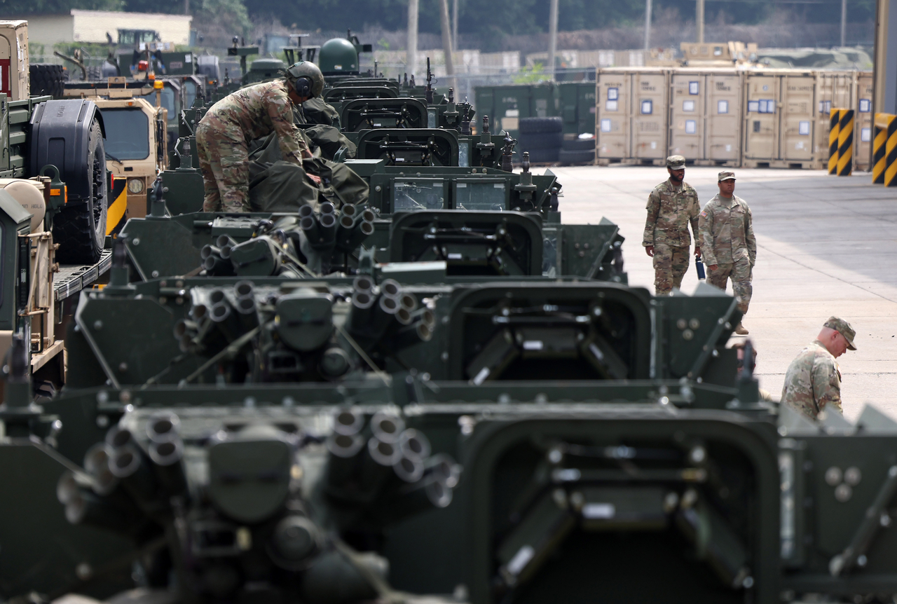 주한미군 제2보병사단 제1스트라이커여단 장병들이 13일 경기 동두천시 캠프케이시에서 새로운 부대와 교대해 본국으로 귀환하는 스트라이커 장갑차를 수송 전 최종점검하고 있다. [뉴시스] |