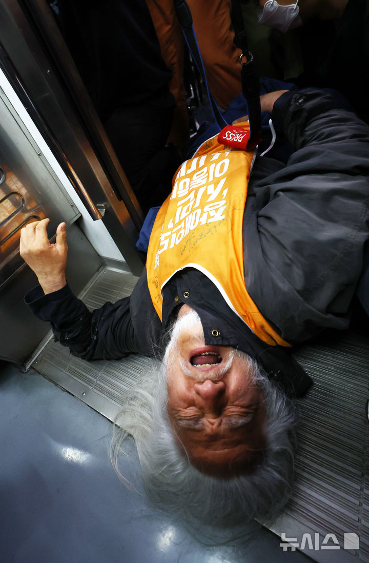 [서울=뉴시스] 박주성 기자 = 전국장애인차별철폐연대(전장연)의 출근길 지하철 탑승 시위가 1년여 만에 재개된 지난 4월21일 서울 지하철 4호선 혜화역에서 전장연 회원이 지하철 탑승을시도하다 서울교통공사 관계자와 충돌하고 있다. 2025.04.21. park7691@newsis.com |