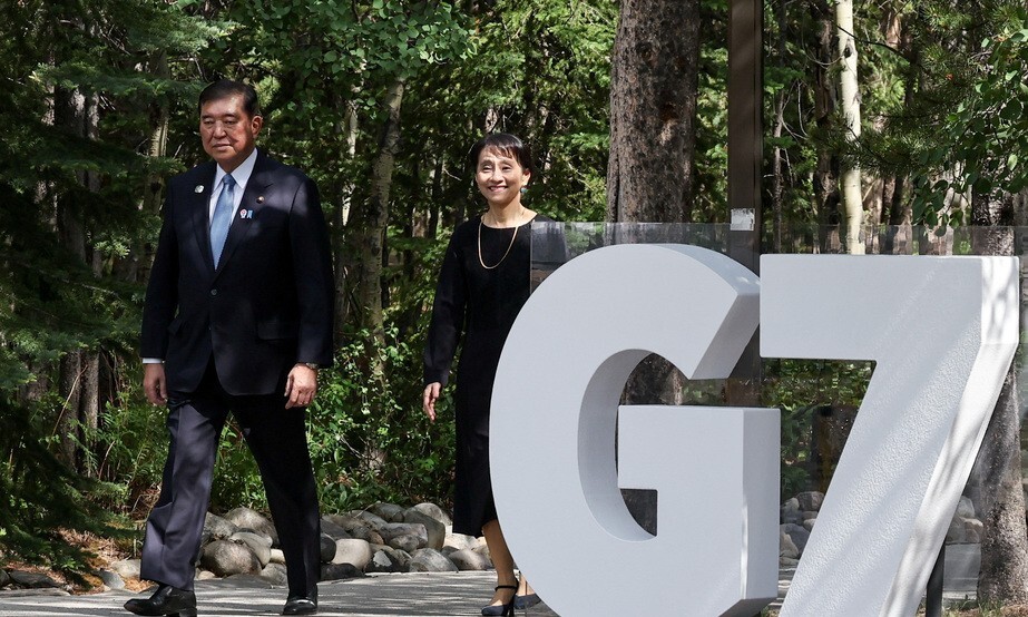 이시바 시게루 일본 총리와 아내 요시코 여사가 16일(현지시각) 주요 7개국(G7) 정상회의 참석을 위해 걸어오고 있다. REUTERS 연합뉴스 |