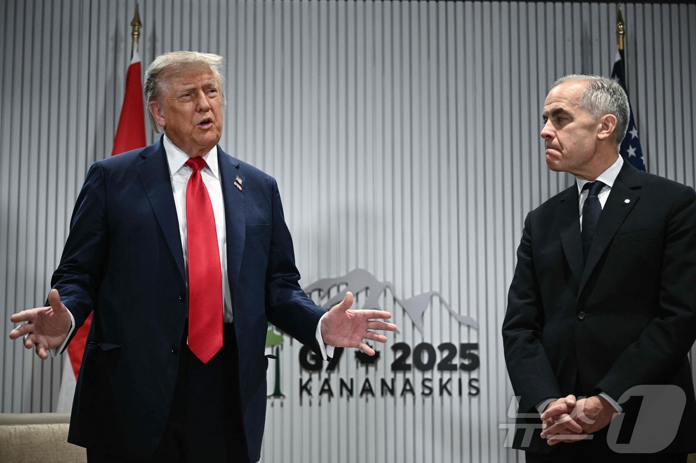도널드 트럼프 미국 대통령이 16일(현지시간) 캐나다 앨버타주 캐내내스키스에서 열린 주요 7개국(G7) 정상회의에서 마크 카니 캐나다 총리가 지켜보는 가운데 기자 질문에 답하고 있다. ⓒ AFP=뉴스1 ⓒ News1 류정민 특파원 |