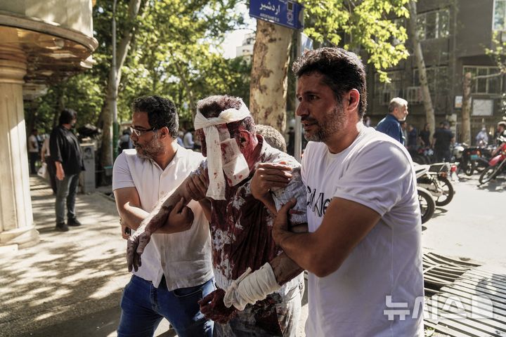 [테헤란=AP/뉴시스] 15일(현지 시간) 이란 테헤란에서 이스라엘의 공습으로 발생한 폭발로 부상한 남성이 부축을 받으며 대피하고 있다. 2025.06.17. |