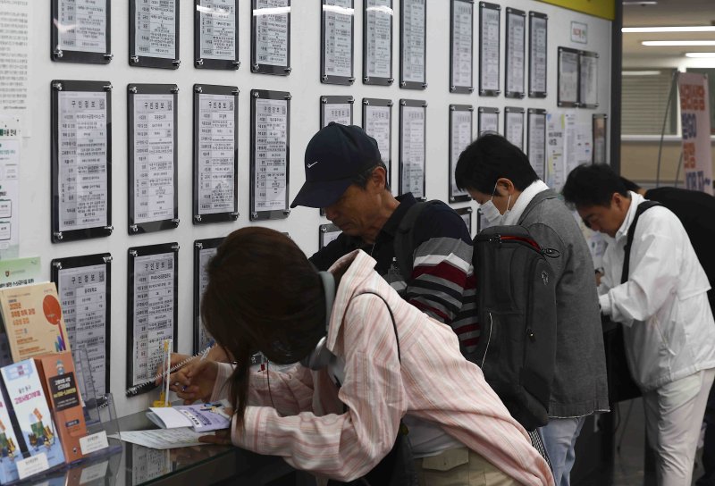 지난달 14일 서울 마포구 서부고용복지플러스센터 일자리 정보 게시판 앞에서 구직자들이 이력서를 작성하고 있다. 뉴시스 |
