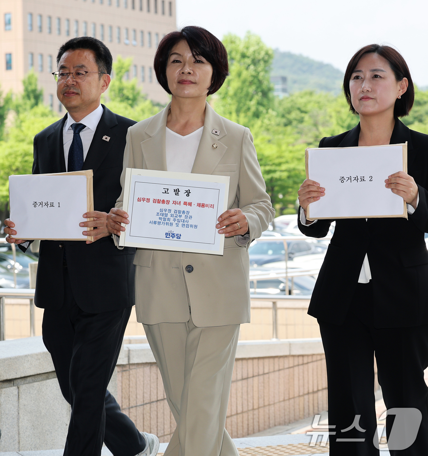 (과천=뉴스1) 오대일 기자 = 더불어민주당 심우정 검찰총장 자녀 특혜채용비리 진상조사단 한정애 단장과 의원들이 17일 오후 경기 과천 고위공직자범죄수사처 민원실에서 심우정 검찰총장 자녀의 특혜채용 비리를 고발하는 고발장을 접수하기 위해 이동하고 있다. 왼쪽부터 박홍배 의원, 한 의원, 백승아 의원. 더불어민주당은 이날 특혜채용 의혹과 관련해 심우정 검찰 총장과 조태열 외교부 장관, 박철희 주일대사 등을 직권남용 권리행사 방해 혐의로 고위공직자범죄수사처에 고발했다. 2025.6.17/뉴스1