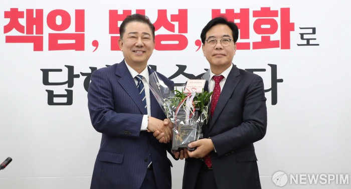 [서울=뉴스핌] 윤창빈 기자 = 더불어민주당 김병기 원내대표가 17일 서울 여의도 국회에서 국민의힘 송언석 원내대표를 예방, 축하난을 전달하고 있다. 2025.06.17 pangbin@newspim.com |
