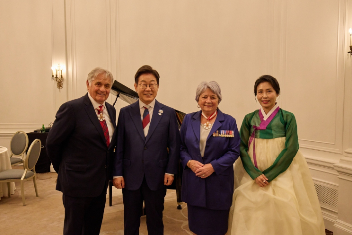 이재명 대통령과 김혜경 여사가 16일(현지시간) 캐나다 캘커리 한 호텔에서 열린 캐나다 총독 내외 주최 주요 7개국(G7) 정상회의 초청국 리셉션에서 메리 사이먼 총독 부부와 기념촬영하고 있다. 연합뉴스 |