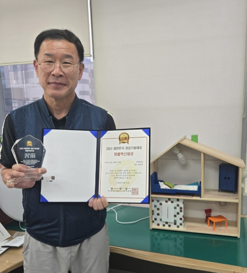 설종안 잔메디텍 대표가 머니투데이 주최의 '2025 제11회 대한민국 리딩기업대상'에서 '스마트 음성 스위치' 부문 '제품혁신대상'을 비대면 수상하고 기념사진을 촬영 중이다.