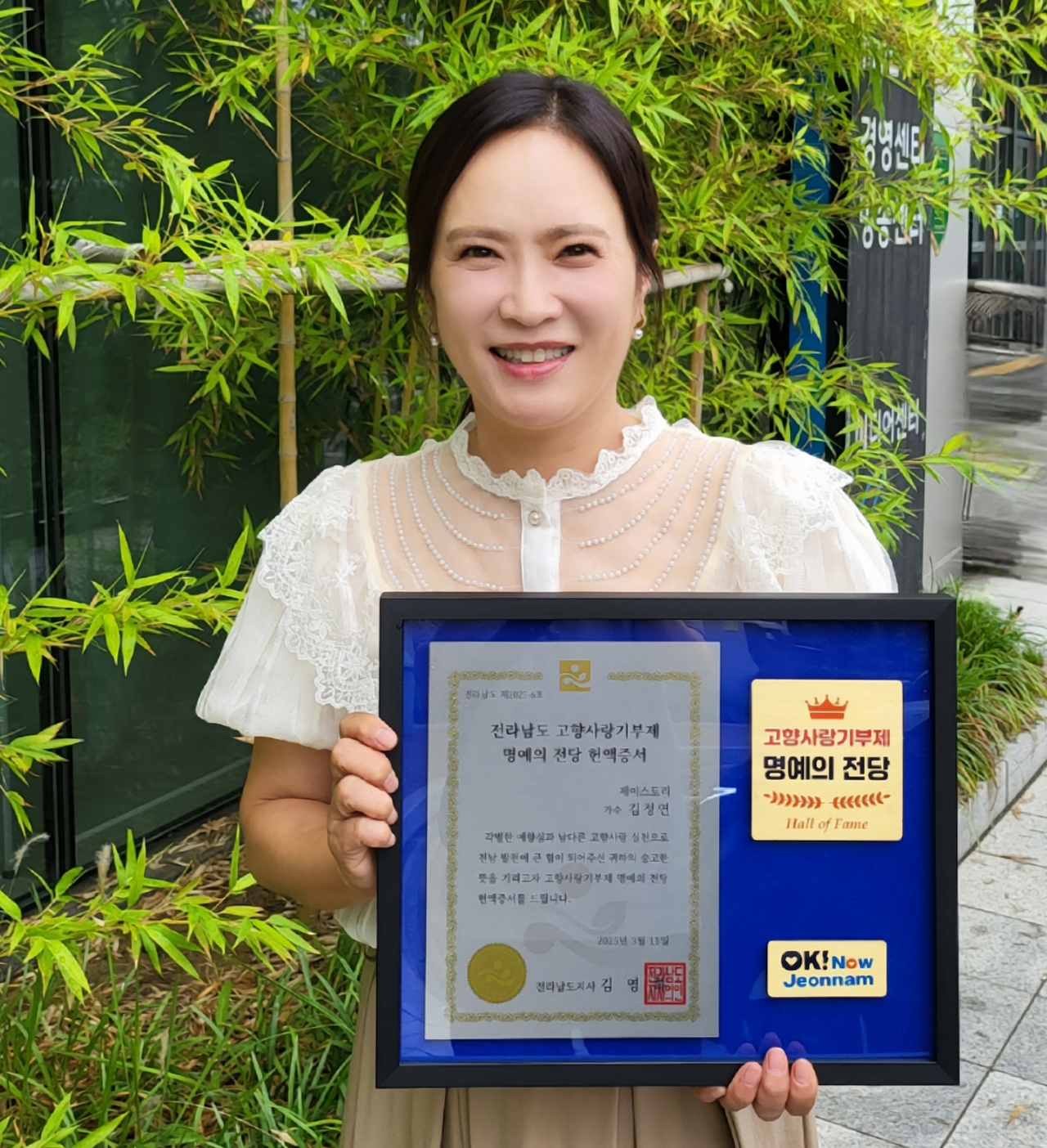 KBS ‘6시 내 고향- 달려라 고향 버스’ ‘우리집 금송아지’를 통해 매주 시청자와 만나면서도 고향사랑기부제 , 농산물 홍보 캠페인, 농촌 어르신 마음 토닥 강연자 등 농촌 사랑을 꾸준히 이어간 활동을 인정받아 최근 전라남도(김영록 도지사) 고향사랑기부제 명예의 전당에 헌액됐다.