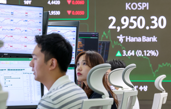 17일 서울 중구 하나은행 본점 딜링룸 전광판에 코스피 종가가 표시됐다. 이날 코스피는 전일 대비 0.12% 오른 2950.30, 코스닥은 0.21% 내린 775.65에 장을 마쳤다. 뉴스1 |
