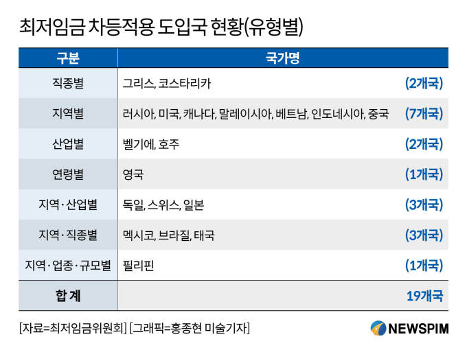 이 부위원장은 "해외 업종별 차등적용 사례를 살펴보면 모두 국가가 정하는 최저임금 보다 높은 상향식 적용이다. ILO 역시 '더 높은 지급능력을 가진 업종에서 상향 적용하라'고 명시한다"며 "일본은 국가가 최저 수준을 설정한 후 노사가 산업별로 정할 수 있게 한다. 미국은 연방 최저임금 기준에 각 주별로 높게 해주는 방식으로 다시 결정할 수 있다"고 말했다.