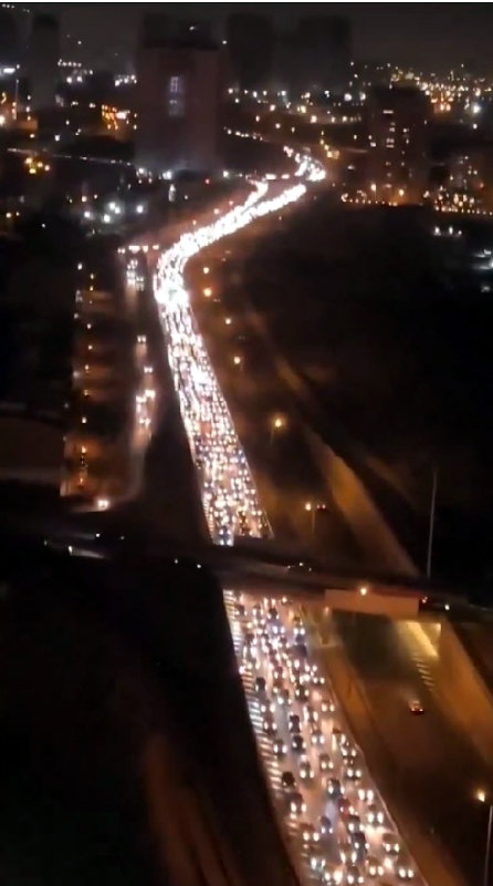 17일 새벽(현지 시간), 이란 수도 테헤란 외곽 도로에 도시를 벗어나 대피하려는 차량 행렬이 길게 이어지고 있다. 이는 도널드 트럼프 미국 대통령이 16일 자신의 소셜미디어 트루스소셜에 “모두 즉시 (이란의 수도) 테헤란을 떠나야 한다”고 경고하고 2시간 뒤쯤 촬영된 사진이다. 사진 출처 X |