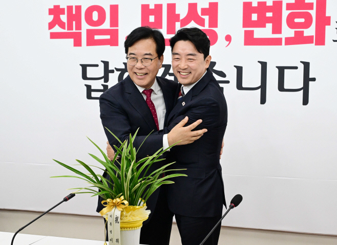 송언석 국민의힘 신임 원내대표가 17일 국회를 찾은 강훈식 대통령 비서실장을 접견하며 포옹하고 있다. /이병화 기자 |
