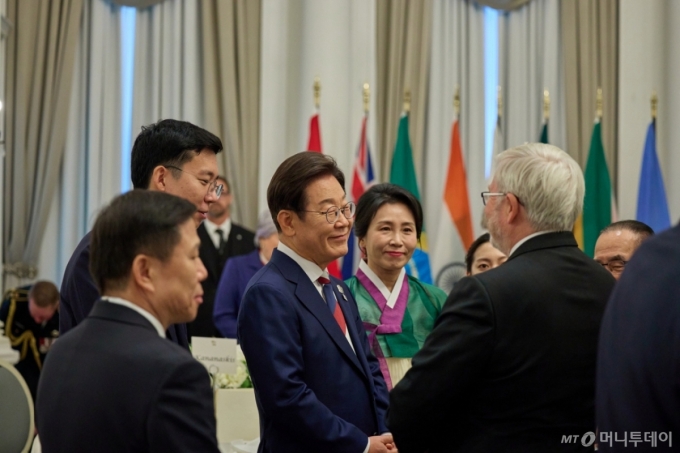 [캘거리=뉴시스] 최진석 기자 = 이재명 대통령과 부인 김혜경 여사가 16일(현지 시간) 캘거리 한 호텔에서 열린 다니엘 스미스 앨버타주 수상 주재 G7 초청국 리셉션에 참석하고 있다. (공동취재) 2025.06.17. myjs@newsis.com /사진= |
