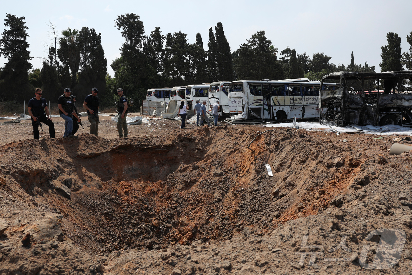 (헤르츨리야 로이터=뉴스1) 김경민 기자 = 경찰관들이 이스라엘 중부 연안도시인 헤르츨리야에서 이란의 미사일 공격을 당한 현장을 살펴보고 있다. 2025.6.17 ⓒ 로이터=뉴스1