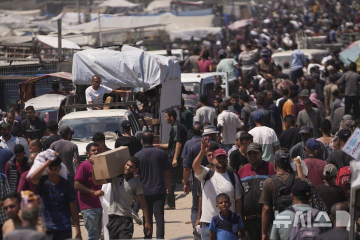 [칸유니스(가자지구)=AP/뉴시스] 유세진 기자 = 가자지구에서 이스라엘군의 총격으로 구호물품을 실은 트럭들을 기다리던 팔레스타인인 최소 45명이 사망했다고 가자지구 보건부 관리들이 17일 말했다.