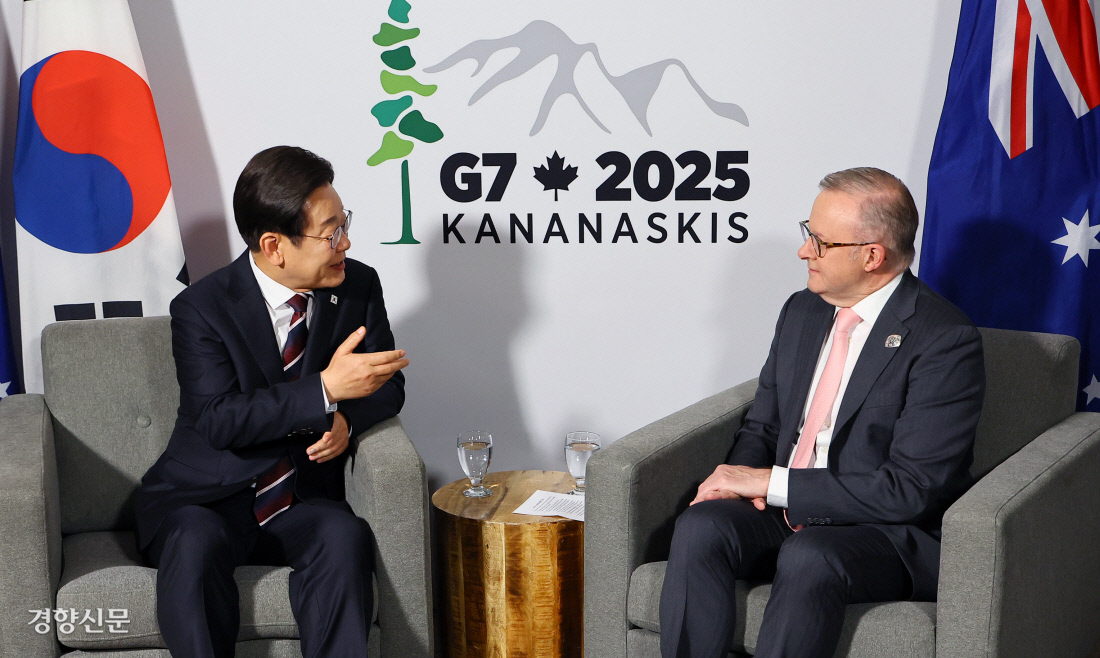 앨버니지 총리 “11월에 APEC 방한”…“저도 호주 찾겠다” 이재명 대통령이 16일(현지시간) 캐나다 앨버타주 캘거리의 한 호텔에서 앤서니 앨버니지 호주 총리와 정상회담을 하고 있다. 두 정상은 주요 7개국(G7) 정상회의 의장국인 캐나다의 초청으로 캘거리를 찾았다. 캘거리 | 김창길 기자 |