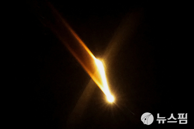 18일(현지시간) 요르단강 서안지구의 투바스에서 포착된 이란이 발사한 미사일. [사진=로이터 뉴스핌] |